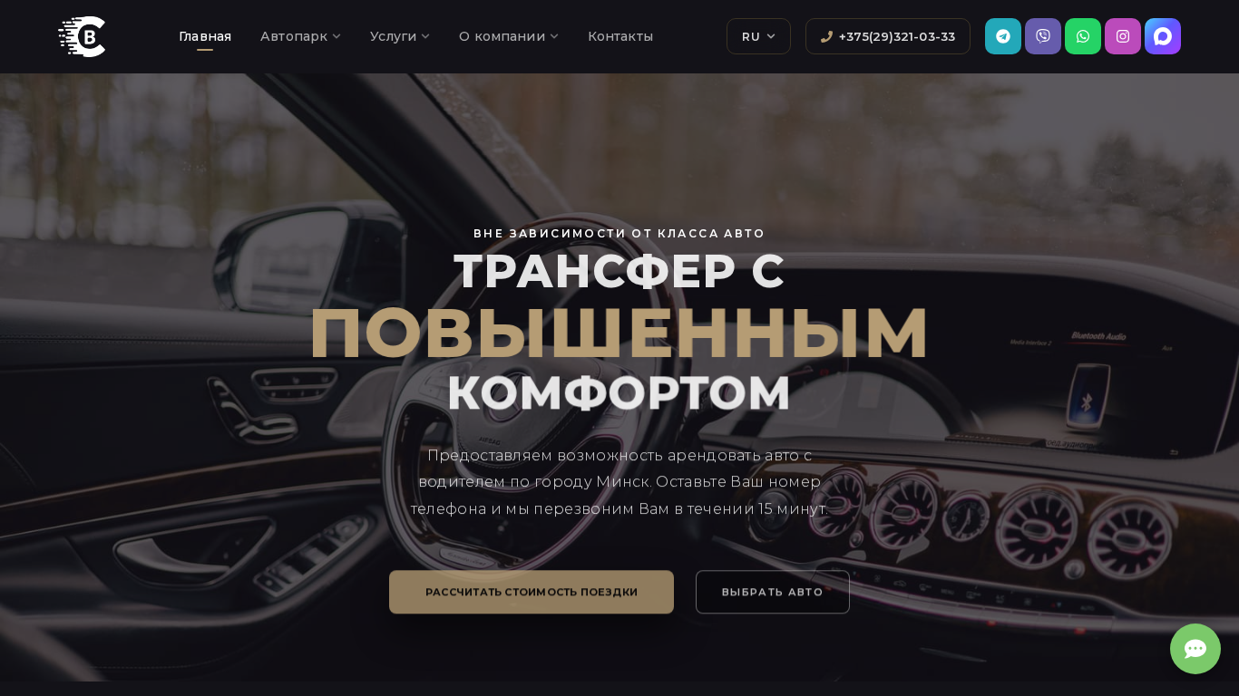 | SEO-описание | Аренда автомобиля с водителем в Минске — ComfortBel. Премиум и бизнес-класс, трансфер в аэропорт, корпоративные поездки, свадьбы. Профессиональные водители, фиксированные цены. Звоните +375 (29) 321-03-33. |