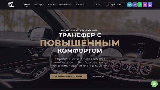 | AI-анализ | The website is a car rental service in Minsk, Belarus, offering premium and business-class vehicles with personal drivers. Services include airport transfers, corporate transportation, weddings, and fixed prices. Contact information is provided for booking. Keywords include renting a car with a driver in Minsk, premium car rentals, airport transfers in Minsk, renting a minivan with a driver, corporate transport, and renting a car for a wedding. The website lists various BMW and Mercedes-Benz models, as well as Volkswagen Passat and Skoda Octavia. Services offered include renting premium cars with drivers, renting minibuses, renting regular cars, airport transfers in Minsk and Minsk-2, organizing vacations and business trips, VIP transfers, and serving corporate clients. The company also offers special tariffs for corporate clients. All vehicles |