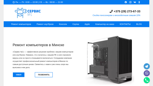 | SEO-описание | Ремонт компьютера в Минске с выездом✅ Цены от 35 руб.✅ Sn1.by - 15 лет опыта! Тел.☎️⭐8 (029) 273 - 67 - 33⭐Звоните - решим любую проблему! |