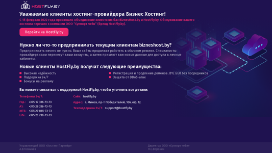 | Адрес | Сайт:, hostfly.by, Адрес:, г. Минск, пр-т Победителей, 106, оф. 12 |