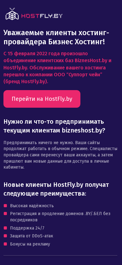 | AI-анализ | language: ru This website, titled "Бизнес Хостинг" (Business Hosting), is a Russian language domain registered in Belarus under the .BY extension. The description tag contains no information, and the keywords tag consists of common words related to website hosting and business, such as "hosting," "business," and "clients." The top_words tag reveals that the website's name is mentioned seven times, "375" and "хостинг" each occur four times, and the brand name "HostFly" appears twice. The website appears to announce a merger between BiznesHost.by and HostFly.by, with client support transitioning to "ООО “Суппорт чейн” (бренд HostFly.by)." No specific information is provided regarding the benefits or changes for existing clients of BiznesHost.by |