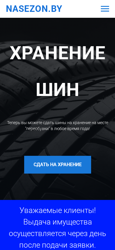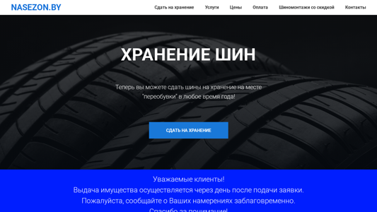 language: by This website is for tire and bicycle storage called NASEZON.BY in Minsk, Belarus. It offers an insulated storage facility with free delivery. The title includes a phone number for contact. The website uses keywords related to tire storage such as "хранение шин," "хранение колес," and "хранение имущества." The top words include "хранение," "насезон," "доставка," "шины," and "услуги." The website offers tire and bicycle storage services with flexible pricing and discounts. The company's contact information is provided for those who wish to inquire or make a reservation. The website also mentions a tire mounting service with discounts.