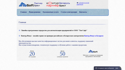 | AI-анализ | Этот онлайн-ресурс, Top Soft g.Brest, является белорусским веб-сайтом, посвященным предоставлению программных решений и услуг для бизнеса. Название сайта — "Top Soft g.Brest", на нем представлены различные программные системы, включая Directum ERP и Galaktika ERP. Описание упоминает "Наши решения" и "Наша помощь", в которую входят консультирование, реализация, техническая поддержка и обучение. Сайт также предлагает статьи и инструкции. Ключевые слова, ассоциируемые с сайтом, включают "системы", "ERP", "управление", "клиенты", "решения", "услуги", "образование", "компании" и "пользователи". Сайт предлагает программные продукты для автоматизации бизнеса, такие как Konur.Focus для верификации российских и белорусских контрагентов, а также Konur.Focus в Беларуси для высококачественных информационных систем клиентов, поддержки изменений в законодательстве и реализации, обслуживания. |