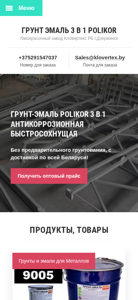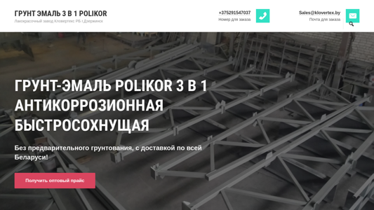 The web project "Грунт эмаль 3 в 1 Polikor – Лакокрасочный завод Кловертекс РБ г.Дзержинск" is a Belarusian website dedicated to selling anti-corrosion, quick-drying ground emulsions under the Polikor brand. The site provides information about various RAL-colored matte coatings, their packaging sizes, and drying times. Visitors can contact the sales department through a phone number or email for pricing inquiries. The website also offers a catalog and an option to receive an opt-in price list via Viber. The domain name is polikor.by.