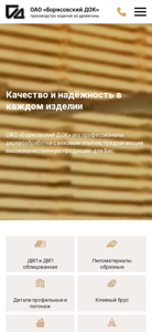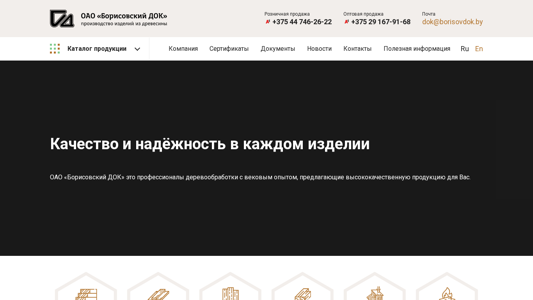 This website is the online presence of OAO "Borisovsky DOK," a leading Belarusian wood processing company with a long-standing tradition in high-quality production. The site offers both retail and wholesale sales, with phone numbers +375 44 746-26-22 and +375 29 167-91-68, and email address dok@borisovdok.by. Products include DVP and DVP-coated MDF, obraznye pilomaterially (obreznye, or cut-to-size, pilomaterially of various sizes and sorts for construction), profilnye and pojonazh details (profiled and skirting boards), kleenyy bruz (laminated wood), sadovye domiki (garden houses), and gran