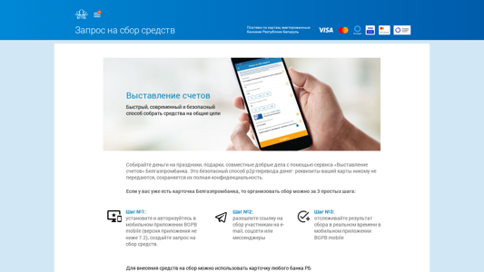 Сайт предназначен для Белорусского банка Благопромышленного банка и предлагает услугу по сбору средств на общих целях под названием "Запрос на сбор средств". Пользователи могут создавать запросы на сбор средств и делиться ссылкой с другими, чтобы те могли внести свой вклад, используя свои белорусские банковские карты. Услуга гарантирует конфиденциальность деталей карт и является безопасным методом платежа P2P. Для использования услуги пользователи должны установить и авторизовать мобильное приложение BGPB, создать запрос на сбор средств и поделиться ссылкой с потенциальными донорами. Вклады можно вносить любыми банковскими картами Беларуси. Сайт также предоставляет подробную информацию о сервисе "Сборы" и предлагает скачать мобильное приложение. Сайт доступен через Linux и Chrome, а контактная информация, пресс-центр и справка находятся на сайте.