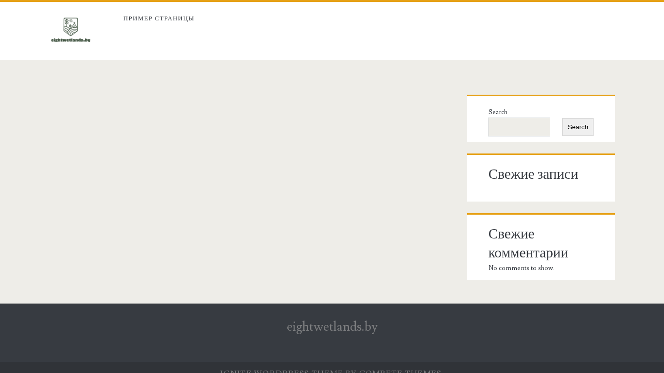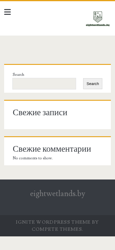 Этот сайт, eightwetlands.by, использует тему WordPress Ignite от Compete Themes. Основное содержимое представлено в боковой панели, также включены функция поиска и боковая панель. Заголовок сайта — "eightwetlands.by", описание не предоставляется. Сайт содержит записи и функцию поиска, маркированную как "Свежие" (Fresh) и "Свежие комментарии" (Fresh comments). На сайте часто встречаются слова "eightwetlands" (4 раза), "поиск" (2 раза), а также "свежие" (2 раза), "пропустить", "содержание", "пример", "страницы", "записи", "комментарии", "комментарии", "показать", и "Ignite". Домен — eightwetlands.