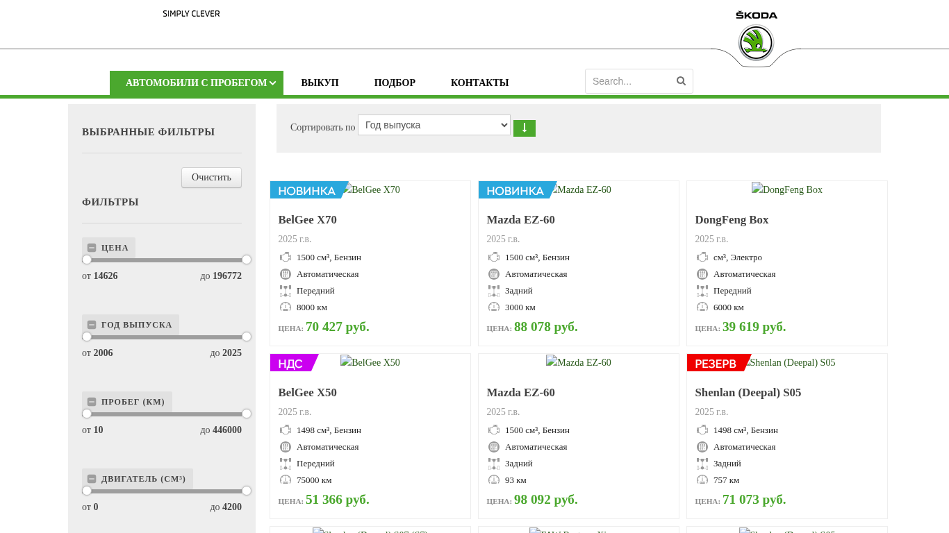 | AI-анализ | The portal "Автомобили с пробегом" (Car with mileage) is a Belarusian website dedicated to selling used cars. It is operated by OOO "ФелОкт-сервис," the general importer of Skoda Auto in Belarus. The website offers a range of used Skoda vehicles for sale, including the Superb and Kodiaq models. Prices for these vehicles range from 211,000 to 247,000 Belarusian rubles. The website also provides information on the time of operation, engine size, type of drive, fuel type, and transmission type for each vehicle. Users can filter their search based on these parameters and can contact the seller for more information. The website operates from Monday to Friday, 09:00 to 20:00, and on Saturdays and |