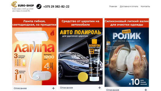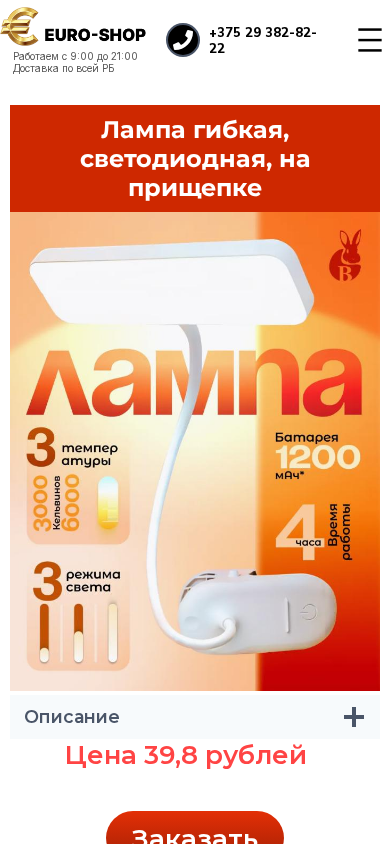 | AI-анализ | The portal Euro-shop is an online shopping mall based in Belarus, selling various goods across the country. It operates from 9:00 to 21:00. Delivery is available throughout Belarus. Contact number is +375 29 382-82-22. The main sections of the site include 'Delivery and Payment', 'Contacts'. The portal offers a flexible LED lamp with 8 LED bulbs, providing economic and long-lasting usage. It has a rechargeable 150 mAh battery that can work for up to 4 hours without recharge. The lamp can be attached as a desk or mirror light using a clip. Users can adjust the lighting modes by pressing a button, from a soft night light to a bright one suitable for reading or drawing. This lamp is suitable for use in children's rooms and study areas, |