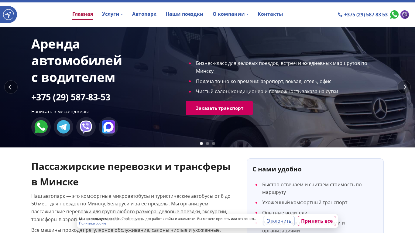 | SEO-описание | Пассажирские перевозки по Минску и Беларуси: трансферы, междугородние поездки, обслуживание групп. Автопарк с водителем: микроавтобусы и туристические автобусы |