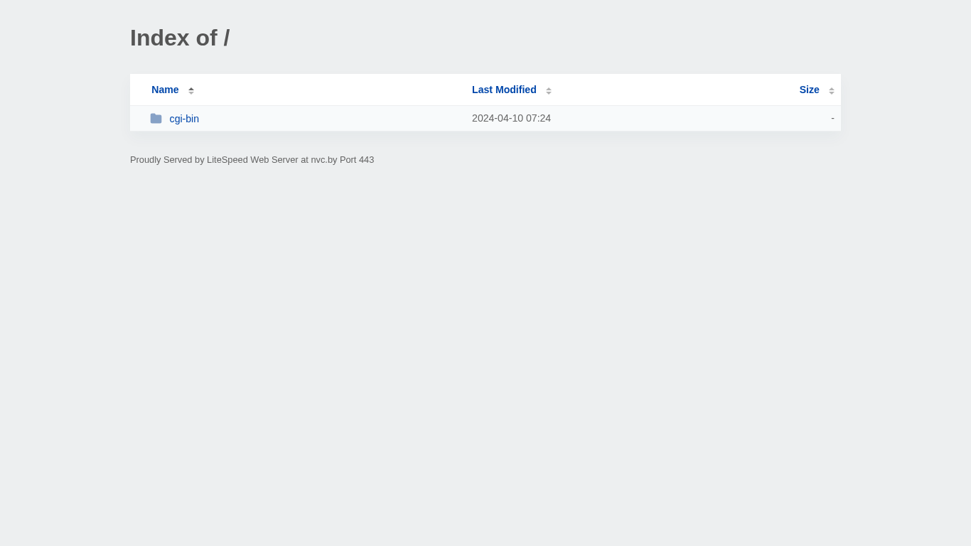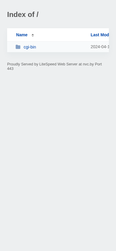 | AI-анализ | This website is the index page of the nvc.by domain, providing a list of files and directories available on the server. The page is served by the LiteSpeed web server and was last modified on April 10, 2024. Keywords associated with the page include "index," "name," "last," "modified," "size," "cgi-bin," and "proudly served." The page also indicates the use of the LiteSpeed web server and the port number 443 for secure connections. |