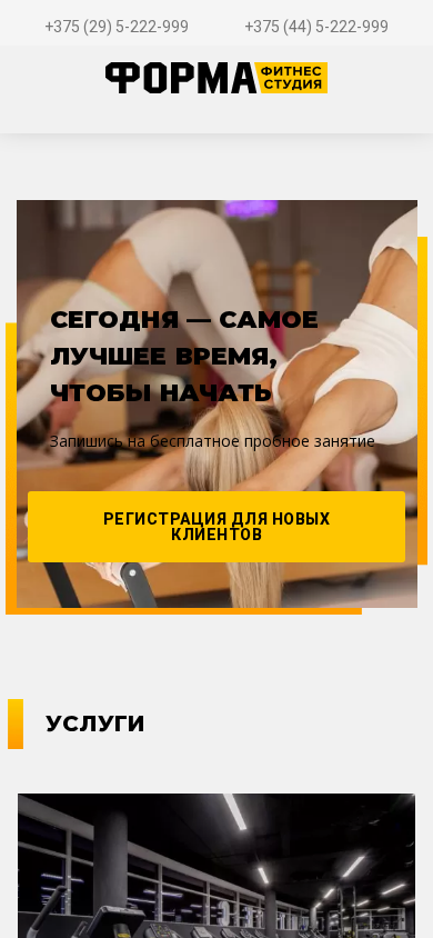 --- This website is for Fitness Studio "Forma" located in Minsk, Belarus. The studio is situated in the shopping center "Tivali," on Pritytskiogo Street, 29, 4th floor. The contacts provided are phone numbers +375 (44) 5-222-999 and +375 (29) 5-222-999. The studio offers various fitness services, such as Pilates, a training hall, body composition analysis, Solariy Spa services, a fitness bar, a children's room, and group classes. The website includes sections for company information, our trainers, a photo and video gallery, customer reviews, vacancies, prices, group classes, and news. The studio is open from Monday to Friday, 7:00-23:00, and