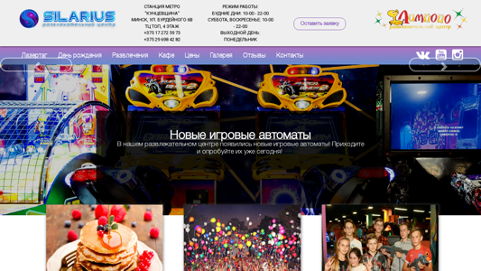 | AI-анализ | The website is for a children's entertainment center named Silarius located in Minsk, Belarus. The center offers various forms of entertainment including laser tag, arcade games, table games, discos, and event hosting for any occasion. The website includes a section for booking events, a large laser tag arena, and a café. New arcade games have recently been added. The contact information includes phone numbers and an email address. The operating hours are from 10:00 to 22:00 every day except for Mondays. |
