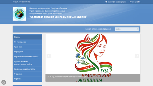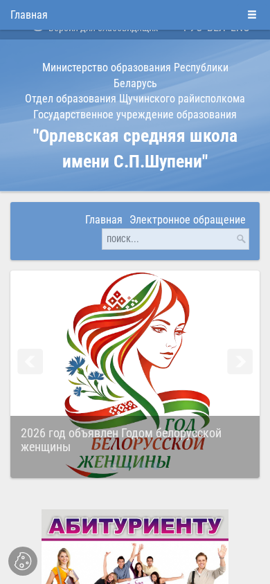 | AI-анализ | The website is for "Орлевская средняя школа имени С.П.Шупени" (Orlovskaya Srednyaya Shkola imeni SP Shupeni), a secondary school located in the Щучинский district of Belarus. The title and numerous top_words indicate it is a state educational institution. The school year 2026 is highlighted, with mentions of various events and initiatives, including the Year of the Belarusian Woman, school days, youth programs, and safety awareness. The website includes sections for news, documents, class information, and a photo gallery. Telephone numbers and contacts for various school departments are listed, as well as information on the school's hockey and active citizen programs. The domain is orlya.schuchin-edu.by. |