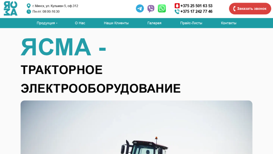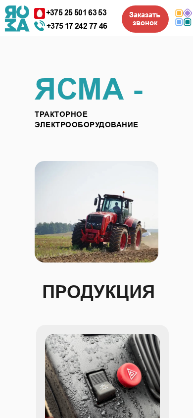 Портал является поставщиком электрооборудования для тракторов в Минске, Беларусь, представляемым компанией ЯСМА. Сайт предлагает высококачественное и доступное электрооборудование для тракторов, включая различные типы выключателей, стартеры, датчики скорости и системы освещения. Продукты разделены на секции, такие как 'Выключатели и реле', 'Фильтры и резисторы', 'Освещение' и 'Вентиляторы рулевой колонки'. Для справок и заказов предоставляется контактная информация, включая телефонный номер и адрес в Минске.