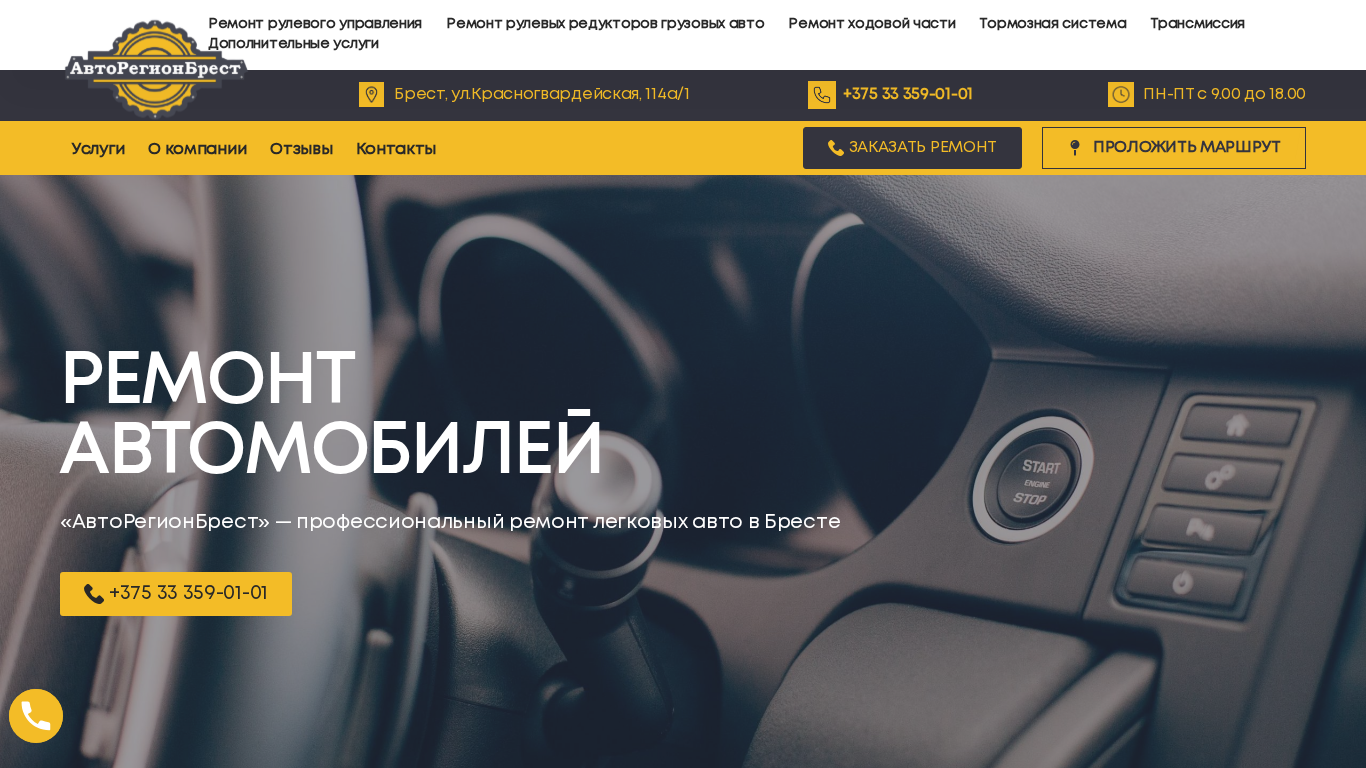 Этот сайт предназначен для "АвтоРегионБрест" (AutoRegionBrest), компании по ремонту автомобилей в Бресте, Беларусь, специализирующейся на ремонте и восстановлении систем управления рулем, редукторов для легковых и грузовых транспортных средств, а также гидравлических насосов. Компания сосредоточена на восстановлении оригинальных компонентов системы управления рулем. Ремонтный цех оснащен необходимым инструментом и оборудованием, соответствующим заводским стандартам. Все отремонтированные детали проходят контроль качества на специализированных стендах, имитирующих реальные условия работы. Предлагаемые услуги включают ремонт систем управления рулем, редукторов для грузовых транспортных средств, подвески, трансмиссии, тормозной системы и гидравлических насосов. Предоставляется информация о контактах, включая адрес, номер телефона и график работы.