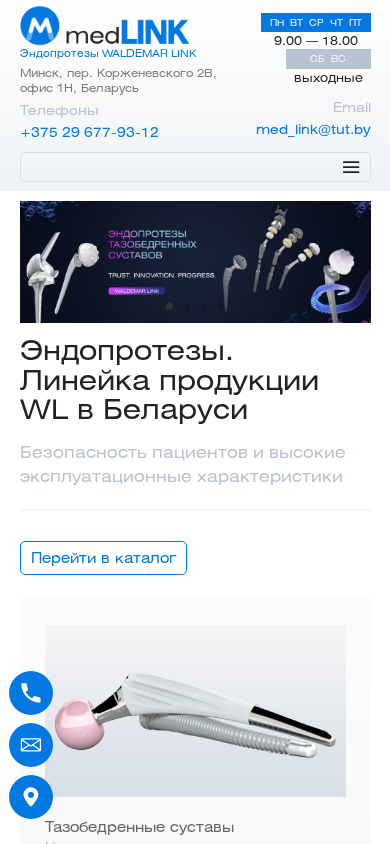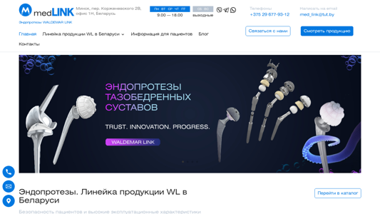 Этот онлайн-ресурс посвящен продаже эндопротезов от компании MedLink в Минске, Беларусь. Он предлагает широкий ассортимент эндопротезов от официального дистрибьютора. Предоставляются контактные данные, включая номер телефона и адрес электронной почты для обращений. Сайт включает разделы по линейке продукции, информации о пациентах, блоге и контактам. Основными категориями являются шиповые суставы, коленные суставы, а также решения для сохранения конечностей. На сайте также представлены индивидуальные решения и части эндопротеза. Продается бренд Waldemar LINK. Сайт работает по будням с 9:00 до 18:00, в выходные дни он закрыт. В контактах указаны номер телефона и адрес электронной почты.