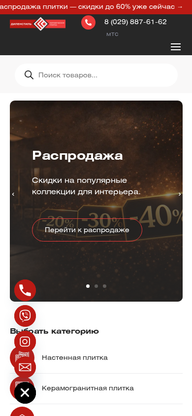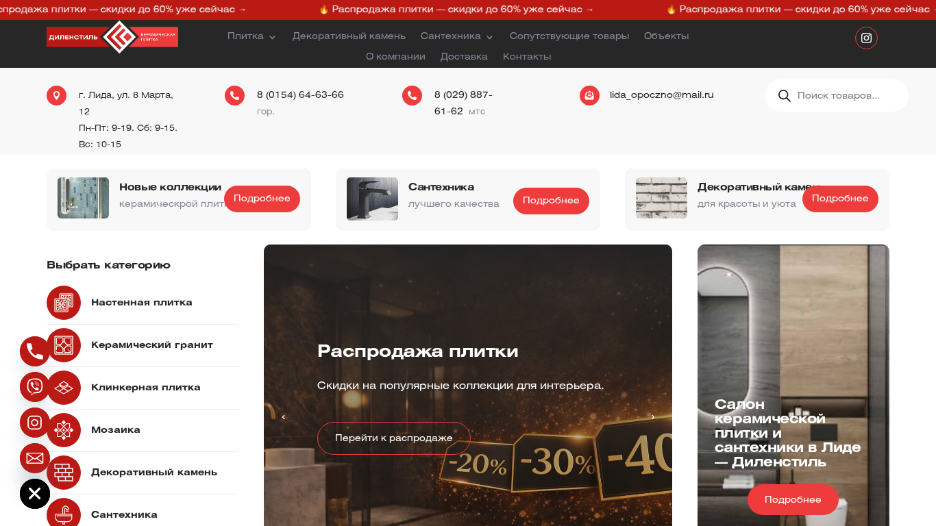 Этот онлайн-ресурс является магазином керамических плиток в Лиде под названием Диленстиль, предлагающим покупку керамической плитки для стен и полов, сантехники, декоративного камня и керамического гранита. На сайте представлены различные виды плиток для кухонь, ванн, туалетов и комнат, а также фасадные плитки, декоративные панели и разнообразная сантехника и краны. В магазине проводится акция со скидками до 60%, предоставляются контакты для справок и заказов. Доменный адрес — dilenstyle.by.