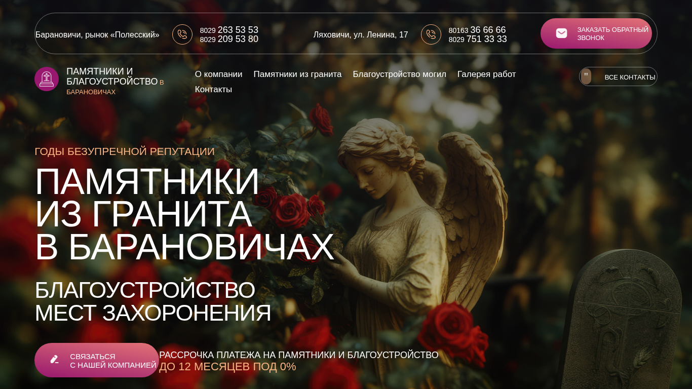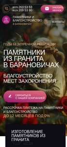 | SEO-описание | Продажа памятников в Барановичах. Установка памятников, оград и благоустройство мест захоронений на кладбищах Барановичах и Барановичского района. |
