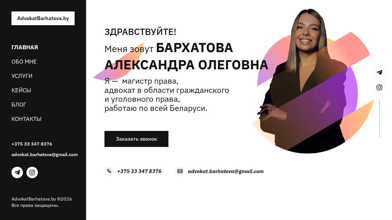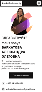 Сайт является личным сайтом адвоката Бархатовой Александры, которая является специалистом по гражданскому и уголовному праву в Беларуси. Сайт включает разделы "О себе", "Услуги", "Дела", "Блог" и "Контакты". Пользователи могут связаться с адвокатом по телефонному номеру +375 33 347 8376 или электронной почте [advokat.barhatova@gmail.com](mailto:advokat.barhatova@gmail.com). Офис адвоката расположен в городе Полоцке, Витебской области, Беларусь, по адресу Советская 2а. Детали банковского счета предоставлены для оплаты. Сайт защищен авторским правом ©2026.