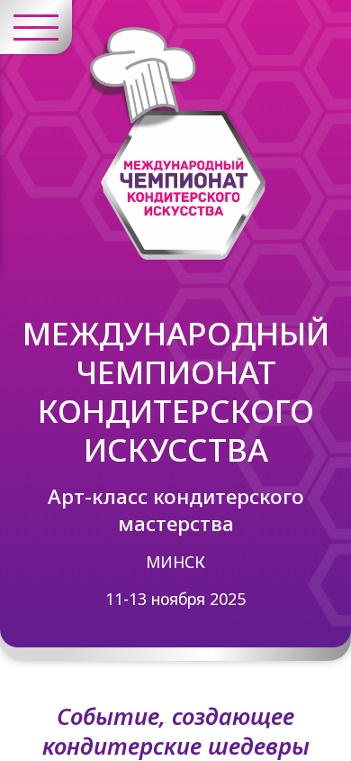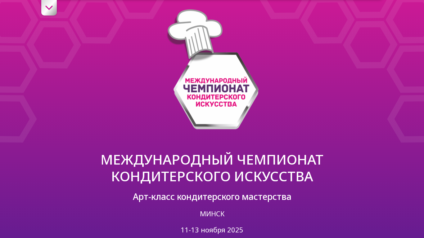 This online resource is dedicated to the International Championship of Pastry Arts 2025. The championship takes place annually in Minsk at the International Specialized Trade Fair-Exhibition "PRODEXPO" and brings together the best pastry chefs from Belarus and abroad. The event includes a program for judges, organizers, and partners, as well as communication and contact information. The International Pastry Arts Championship offers the following art-class categories: D1. Sugar flowers, D2. Carousel work, D3. Chocolate work, D4. Pastillage sculpture, D5. Marzipan work, D6. Wedding cake, D7. Exclusive wedding cake, D8. 3D cake sculpture, D9. Artwork from dough, D10. Gingerbread 2D, 3D, D11. Artwork from cold food products