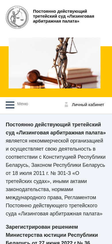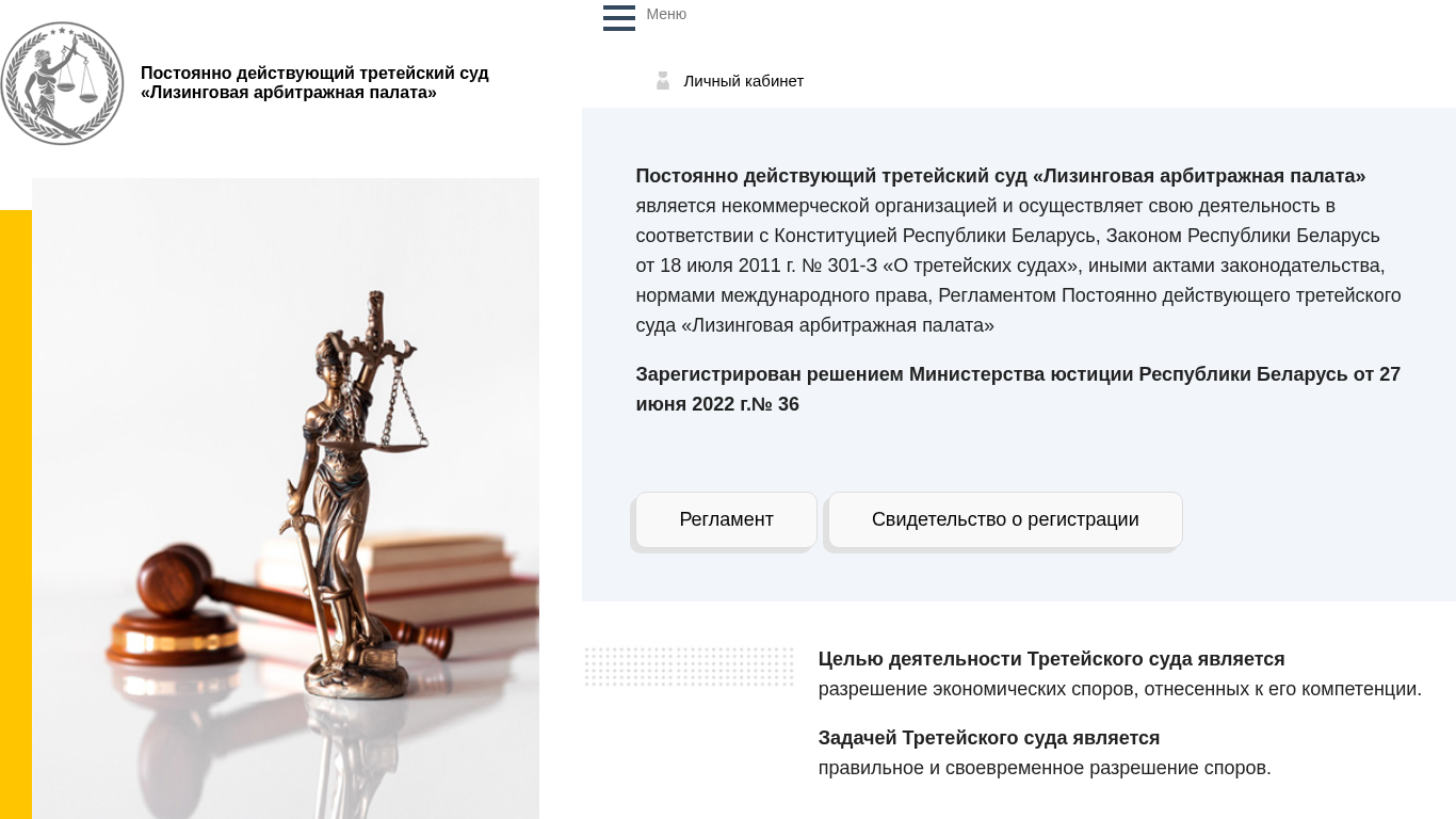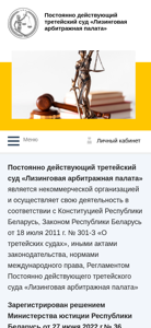 --- This website is the official homepage of the Permanent Arbitration Court 'Lizingo Arbitration Chamber' in Belarus. The website operates as a non-profit organization, adhering to the Constitution of the Republic of Belarus, the Law of the Republic of Belarus No. 301-Z 'On Arbitration Courts', and other relevant legislation and international laws. The Arbitration Chamber was registered with the Ministry of Justice of the Republic of Belarus in June 2022. The primary goal of the Arbitration Court is to resolve economic disputes falling within its jurisdiction in a fair and timely manner. The website provides information about the composition of the Arbitration Court, the size of the arbitration fee, the parties involved in the arbitration agreement, and the process of filing a claim, among other things.
