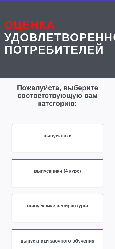| SEO-лексика | выпускники оценка удовлетворенности потребителей пожалуйста выберите соответствующую вам категорию курс аспирантуры заочного обучения магистратуры читатели библиотеки потребители научной продукции работники |