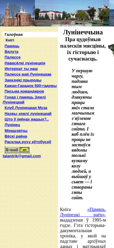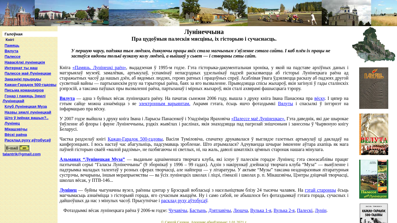 | AI-анализ | This online resource is dedicated to the history and current state of the Luninets District in Belarus. The title of the website is "Лунінецкі раён. Ад часоў першабытных — да нашых дзён" which translates to "Luninets District. From ancient times to our days." The description includes keywords such as "Luninets," "history," "museum," and "memorial." The top words in the description are "лун" (Luninets), "нецк" (Neck), "часо" (time), "памяць" (memory), "палессе" (Polesie), "муза" (museum), and "годзе" (years). The website likely contains information about the history of Luninets District, its people, and notable places |