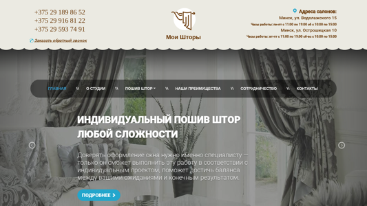 | SEO-описание | Пошив штор в Минске недорого. Консультация дизайнера. ✓Любые стили интерьера. ✓Выбор ткани. Звоните! ☎+375 (29) 1898652, ☎+375 (29) 9168122. |