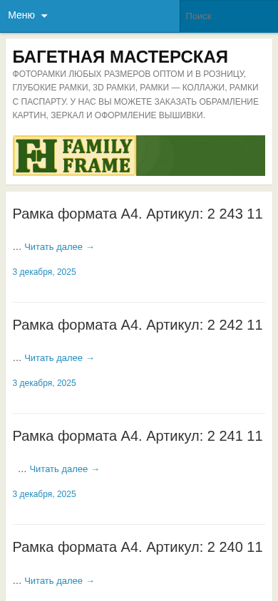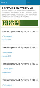 | AI-анализ | This website is a photography frame and picture framing service called Family frame. It offers various types of frames including plastic, wooden, 3D, collages, and frames with pasparte. The company also provides services for mounting canvas, framing paintings, and decorative embroidery. The website lists several products such as A4 plastic frames, wooden frames, and deep frames, among others. The site is built on WordPress and contact information is available for purchasing in Minsk. |
