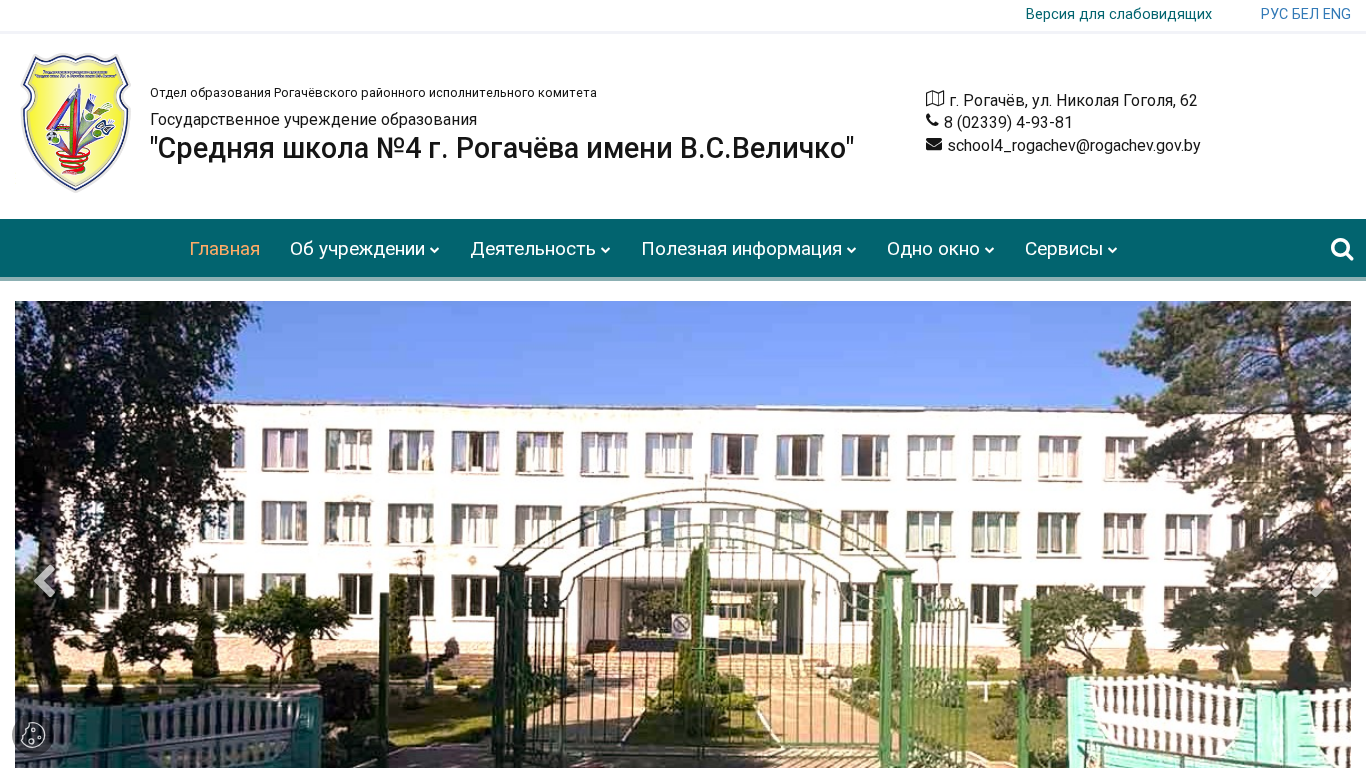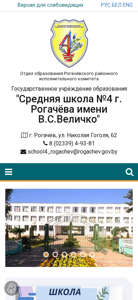 | Адрес | Сокращенное название:, ГУО, "Средняя школа №4 г. Рогачёва имени В.С.Величко", Юридический адрес:, г. Рогачёв, ул. Николая Гоголя, 62 |