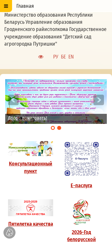 | AI-анализ | The portal "Детский сад агрогородка Путришки" (Children's Garden of the Village Council of Putrishki) is a state educational institution under the Ministry of Education of the Republic of Belarus. The website provides information about the kindergarten, including news, registration procedures, and contact details. Keywords associated with the site include 'education,' 'detailed,' '2026,' 'institutions,' 'Putrishki,' 'children's,' 'garden,' 'news,' 'citizens,' 'preschool,' 'republic,' 'Belarus,' 'Grodno region,' 'work,' 'personal,' 'reception,' 'policy,' 'processing,' 'children,' 'relationships.' The site offers various options for personal consultations, including at the kindergarten, in the education administration, and at higher-level educational |