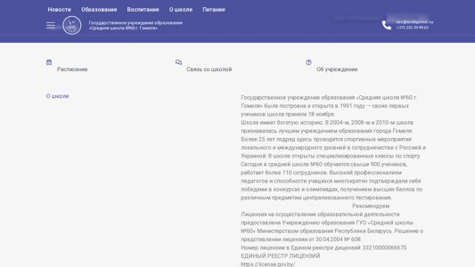 | AI-анализ | This website is the official site for Middle School Number 60 in the city of Gomel, Belarus. The title is 'Главная - Средняя школа №60 города Гомеля' (Main - Middle School Number 60 of the City of Gomel). The description includes information about the upcoming year 2026 being declared the Year of the Belarusian Woman, as well as sections on education, upbringing, the school, food, and accessibility for visually impaired individuals. The top keywords include 'школа' (school), 'гомеля' (Gomel), 'средняя' (middle), 'комментариев' (comments), 'нет' (no), 'read', 'more', 'подробнее' (detailed), 'гуо' (what), 'шестой' ( |