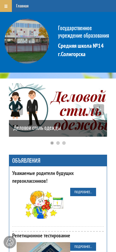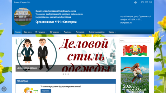 | AI-анализ | This website belongs to Middle School No. 14 in Soligorsk, Belarus. The title is "Средняя школа № 14 г. Солигорска" and it is operated by the Ministry of Education of the Republic of Belarus, Soligorsk Regional Education Administration, and Soligorsk City Executive Committee. The website provides information about the school, its regulations, contact details, and various educational resources. Key topics include safety, education, rules, and organization. Visitors can find information about the school's schedule, administrative procedures, and electronic services such as an electronic sirevice request system and a rating evaluation portal. The school also offers various educational programs and resources, including engineering and technical centers, electronic textbooks, and safety guidelines. The website is available in Russian, Belarusian, and English languages. |