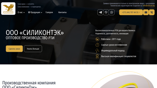 | AI-анализ | The portal SiliconTek is a producer of rubber technical items (RTI) from silicone and industrial seals made to order based on the pattern from the manufacturer SiliconTek. The company has been in operation since 2011 and offers silicone RTI and industrial seals in bulk. Contact information for placing orders is provided through email at info@silicon.by. The website includes sections on the company, its products, and contact information. Products include silicone tubing, profiles, and wires, as well as seals for autoclaves, silicone rails, silicone sheets, and silicone mixtures. The site also offers inflatable and pneumatic seals with a nipple, and form products made from RTI. Armed silicone hoses and various types of pipes, valves, and fittings are also available |