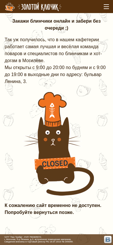 | AI-анализ | Сайт "Золотой ключик" является предприятием, связанным с пищей, расположенным в Могилеве, Беларусь. Название и описание указывают на то, что они специализируются на блинах (блинчиках) и хот-догах, предлагая онлайн-заказ и самовывоз без необходимости стоять в очереди. Ключевые слова включают "Ленина", "золотой", "ключик", "сделать", "заказ", "оставить", "отзыв", "закажи" и "без". Верхние слова указывают на то, что бизнес расположен по Ленинской улице и работает с 9:00 до 20:00 в рабочие дни и с 9:00 до 19:00 в выходные. Предприятие является Частной единой предприятием "Лан Трейд" с регистрационным номером 790365972. |