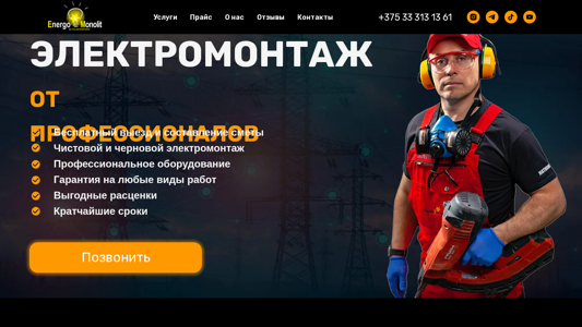 | AI-анализ | --- The web project "Energomonolit.by" is dedicated to electrical mounting works in Minsk. The title of the website is "Электромонтажные работы" and the description mentions "электромонтажные работы в Минске". Keywords include "электромонтаж", "заказать", "работы", "электрических щитов", "расценки", "сроки", "профессионалов", and "гарантия". The website offers various electrical mounting services such as in apartments, homes, kitchens, offices, and production sites. Additional services include the assembly of electrical panels, commercial electrical mounting, and plumbing, heating, and ventilation work. The website also features reports on each stage of the work and professional equipment usage. The company claims to have a client-oriented approach |