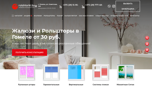 | SEO-описание | Жалюзи и Рольшторы в Гомеле КУПИТЬ по Честной ЦЕНЕ В РАССРОЧКУ без %. ⭐ Бесплатный замер ✔ Онлайн калькулятор ✔ Рассрочка 💥 Доставка = 0 BYN. 🔥 Гарантия 10 лет. ✔ Быстрая установка ✔ Оплата по факту установки! |