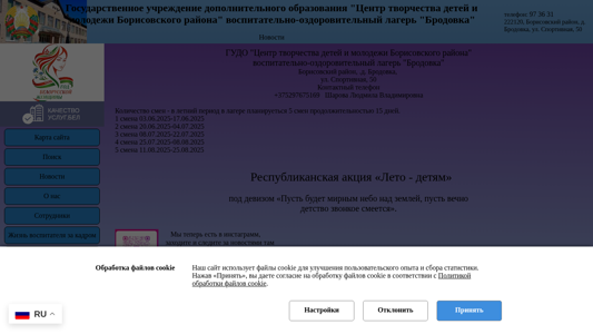 Адресвоспитательно-оздоровительный лагерь "Бродовка", Новости, телефон:, 97 36 31, 222120, Борисовский район, д. Бродовка, ул. Спортивная, 50