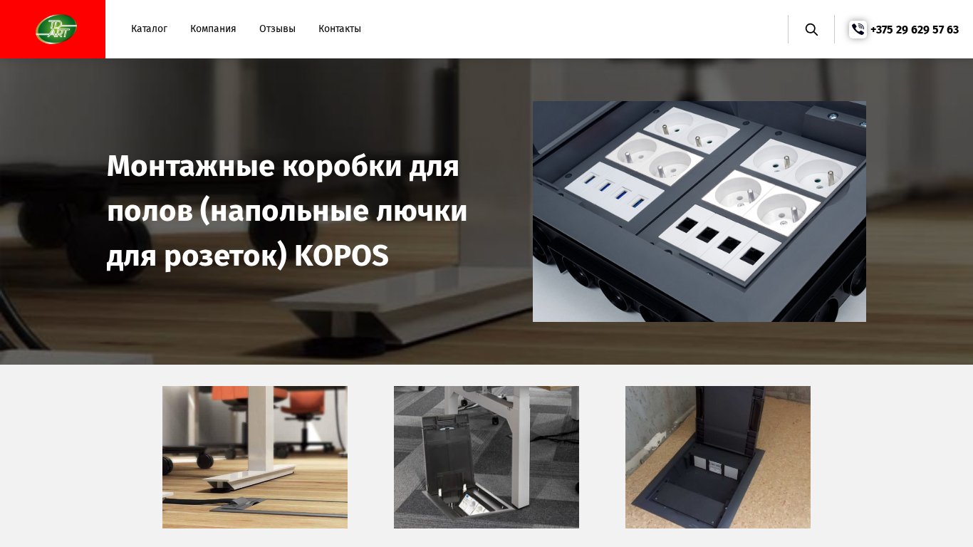 Проект веб-сайта Kopobox представляет собой каталог для полок и сопутствующих товаров компании KOPOS. Он предлагает высококачественные и надежные полки для розеток на различных типах полов, включая те, что подходят для открытых офисных пространств. Полки подходят для крупных офисных зданий, где рабочие места не могут быть размещены близко к стенам. Они позволяют установку розеток для телевизора, телефона, компьютера и других устройств. Полки и розетки, встроенные в пол, обладают современным дизайном, эргономичны и соответствуют требованиям безопасности. Каталог Kopobox включает различные виды полок и сопутствующих товаров, среди которых KOPOBOX 57_LB, KOPOBOX 80_LB, KPP 80_LB, KUP 57_FB, KUP 80_FB, PKUP_LB, PLUK 1_XX.
