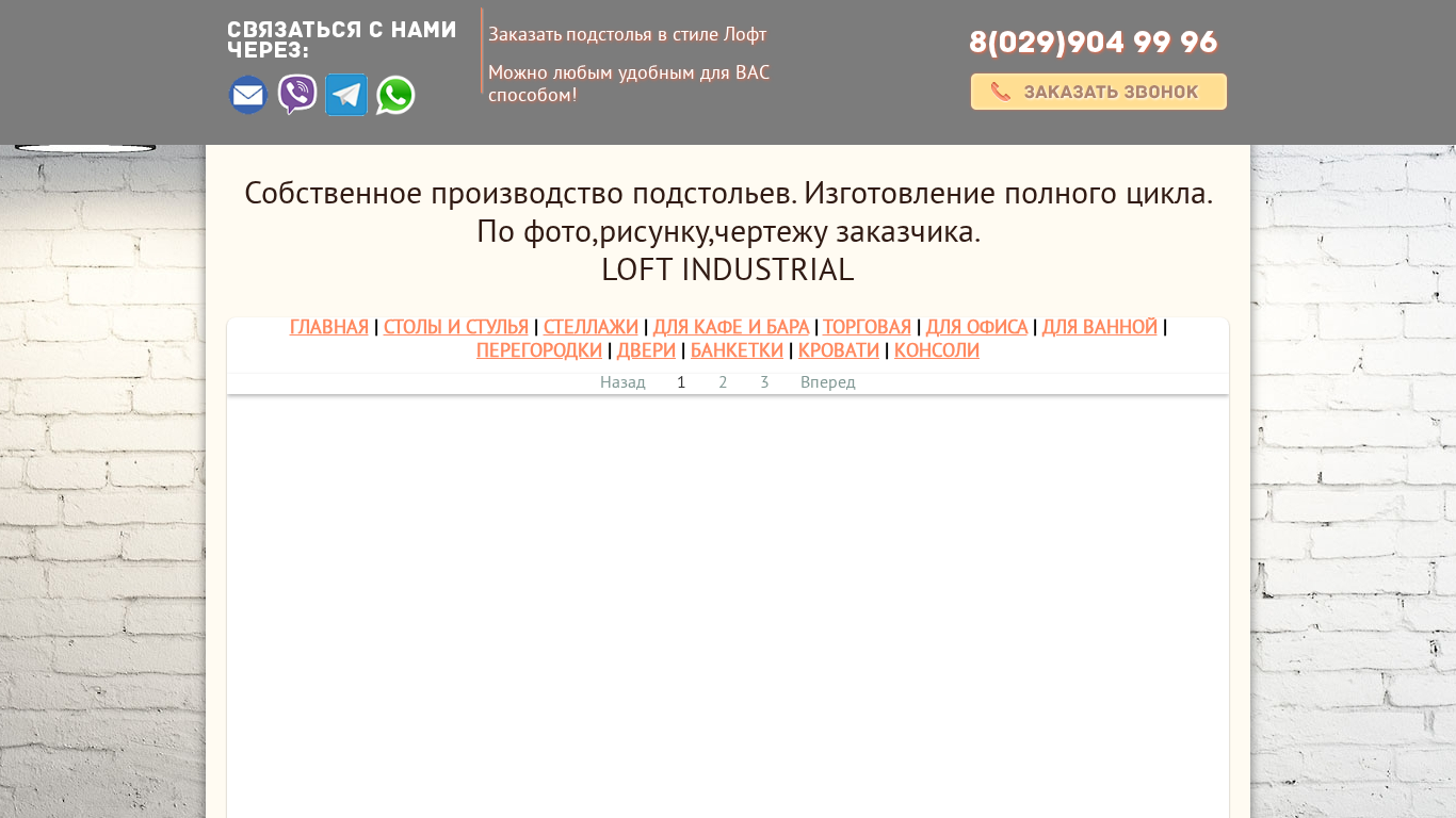 | Адрес | подстольев лофт., Собственное производство и лучшие цены в РБ., 8(029)904 99 96, ЗАКАЗАТЬ ЗВОНОК, г. Минск, ул. Игнатенко, дом 7 |