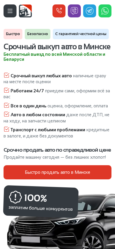 | Название / Заголовок | Срочный выкуп авто в Минске ✔️ продать автомобиль быстро, СРОЧНО и ДОРОГО, скупка авто в любом состоянии |