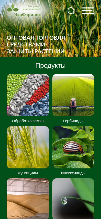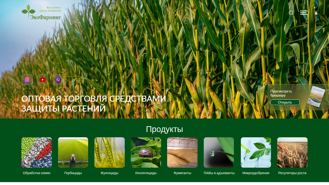| SEO-описание | ООО «ЭкоФарминг» – оптовая торговля средствами защиты растений, аминокислотами и микроудобрениями. Сопровождение применения реализуемых гербицидов, инсектицидов, фунгицидов, фумигантов, препаратов для предпосевной обработки семян. |