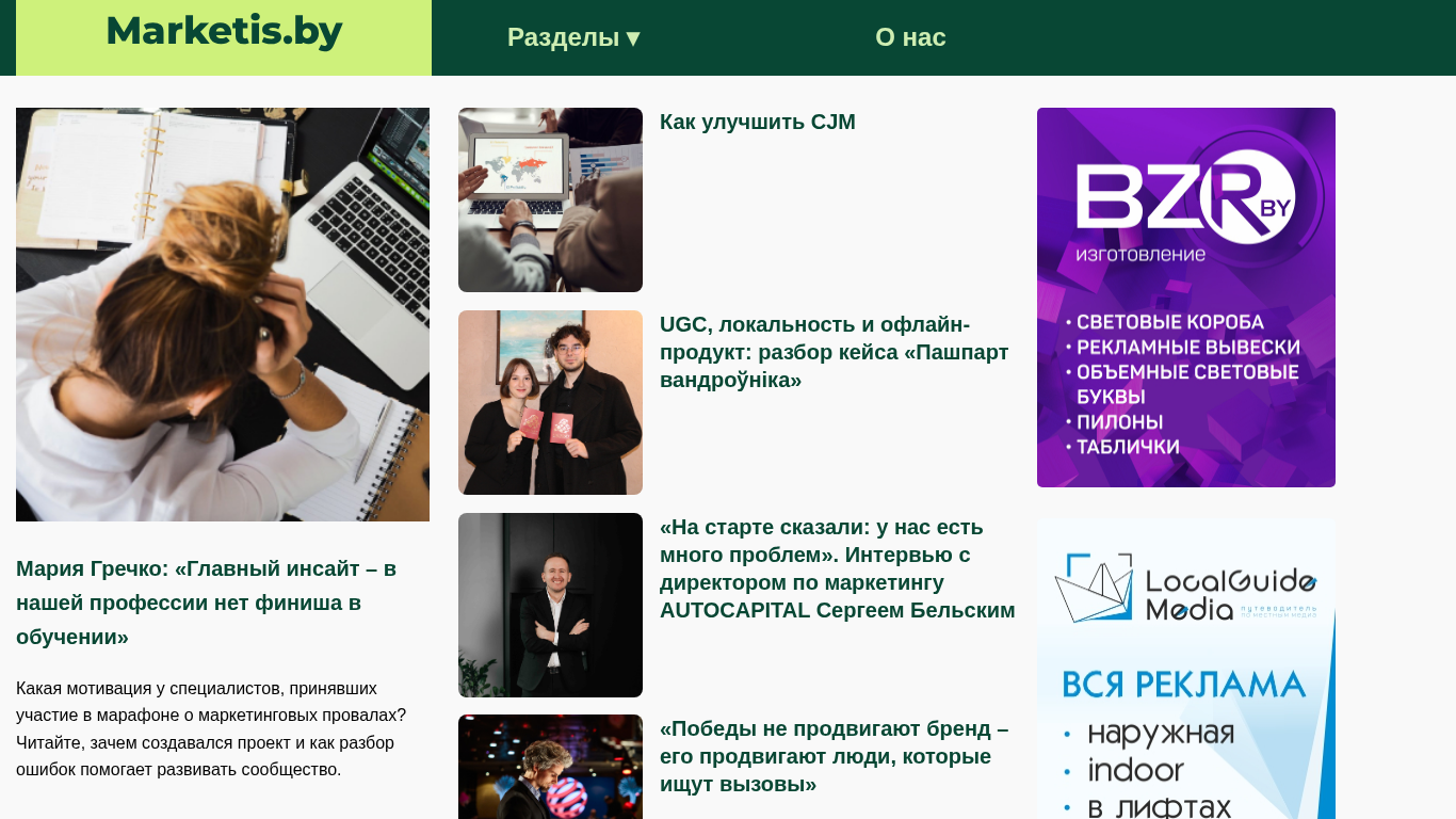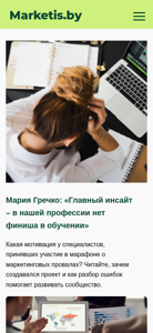 This website, Marketis.by, is a news platform providing the latest news in marketing and technologies. The title of the website is 'Новости маркетинга и технологий | Marketis' (Marketing and Technologies News | Marketis). The website contains various sections such as 'О нас' (About Us), 'SMM' (Social Media Marketing), 'Бренд' (Brand), 'Глубокий разбор' (Deep Dive), 'Исследования' (Research), 'Наружная реклама' (Outdoor Advertising), 'Новости' (News), 'ИИ-AI' (Artificial Intelligence and I), 'Дизайн' (Design), 'Digital' (Digital), 'Видео' (Video), 'Ивенты' (Events), 'Интервью'