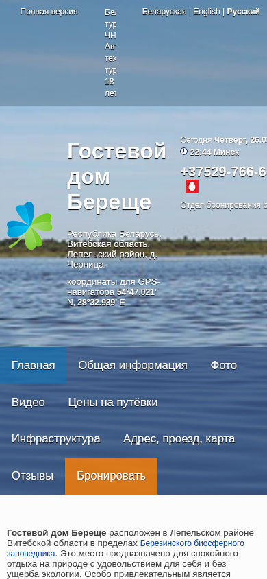 | AI-анализ | The website is for a guest house named Береще, located in the Lepeльsky district of the Vitebsk region in Belarus. It is situated within the Berezinsky Biosphere Reserve and offers a peaceful retreat in nature without harming the environment. The main attraction is the large lake Береще, popular among fishing enthusiasts. The lake is abundant with various fish species, including щука, плотва, лещ, and язь. Guests reside in a one-story cottage, featuring comfortable rooms, a spacious hall with a fireplace and kitchen, a gazebo for large groups, and a place for barbecue. The house also has a small pebbled beach on the lake shore, perfect for enjoying sunny weather. Video and photo content are available for viewing. Prices for Belarusian citizens, Russians, and other foreigners are listed in |