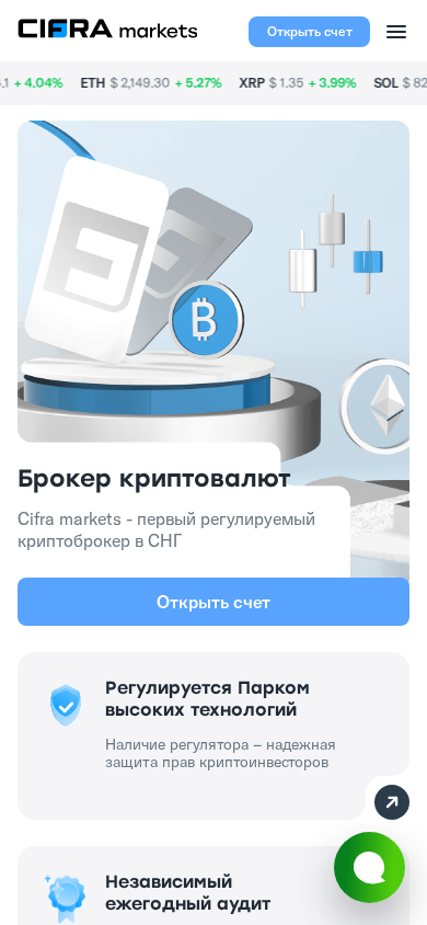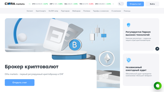 Сайт Cifra Markets — это белорусская платформа для торговли криптовалютой, предлагающая продажу криптовалюты для удобной и комфортной торговли. Пользователи могут покупать криптовалюту с помощью карт и наслаждаться надежными услугами брокера по криптовалютам Беларуси с актуальными курсами обмена. Cifra Markets является первым регулируемым брокером по криптовалюте в регионе СНГ, под наблюдением Парка высоких технологий. Платформа разработана для как опытных, так и начинающих инвесторов и предлагает широкий спектр криптовалют, включая BTC, ETH, XRP, SOL, TRX, ADA, LTC, DOGE, USDT и BNB. Платформа проста в использовании и предлагает простые операции по депозиту и снятию средств как на fiat, так и на криптовалюту. Cifra Markets работает более 10 лет и является частью Cyfra.