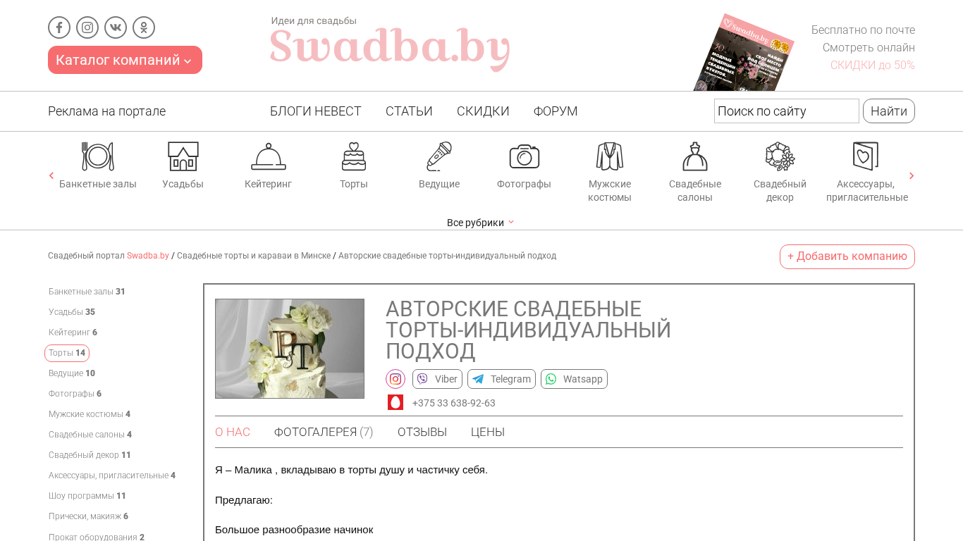 | SEO-описание | Свадебные торты в кондитерской Авторские свадебные торты-индивидуальный подход - торты и кондитерские изделия на свадьбу в Минске с фото и ценами. Адреса, контакты и отзывы. |