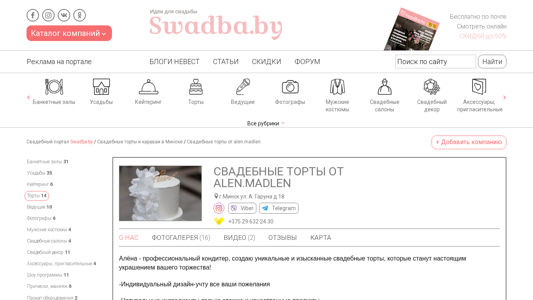 Портал alenmadlen.swadba.by предлагает широкий ассортимент свадебных тортов и кондитерских изделий для проведения свадьбы в Минске, включающий фотографии и цены. Сайт также предоставляет адреса, контакты и отзывы. Ключевые слова включают в себя свадебные торты, Минск, и кондитерские изделия. На первом месте находятся торты (торты), свадьбы (свадьба), аксессуары (аксессуары), банкетные залы (банкетный зал), усадьбы (усадьба), кейтеринг (кейтеринг), ведущие (ведущий), фотографы (фотограф), мужские костюмы (мужской костюм), салоны красоты (салон красоты), декор свадебного мероприятия (декорация), шоу программы (шоу-программа), и свадебные программы (программа свадьбы).
