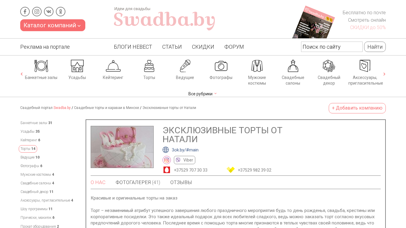 | SEO-описание | Свадебные торты в кондитерской Эксклюзивные торты от Натали - торты и кондитерские изделия на свадьбу в Минске с фото и ценами. Адреса, контакты и отзывы. |