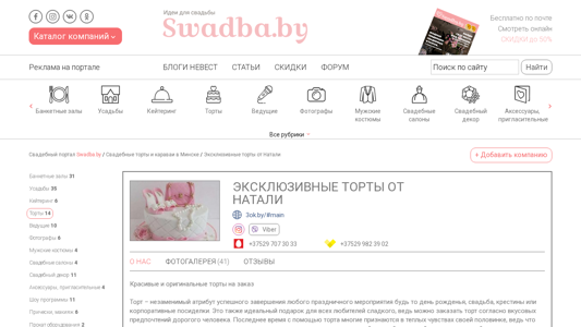 | AI-анализ | Портал "Эксклюзивные Торты Натальи" - Свадебные Торты и Кондитерские Изделия в Минске с Фотографиями и Ценами. Залы для Приема Гостей, Замки Подготовка Кулинарных Блюд Торты Ведущие Фотографы Мужская Одежда Свадебные Салоны Декорация Свадьбы Аксессуары, Инвити Шоу Программы Стайлинг, Макияж Оборудование для Аренды Автомобилей на Свадьбу Видео Съемка Ландшафтные Комплексы Музыканты, Кавер-Бэнды Зажигание, Фейерверки. На сайте представлен каталог компаний, блоги, статьи, скидки и форум для планирования свадьбы. Он включает в себя различные рубрики, такие как залы для приема гостей, замки, кулинарные услуги, торты, ведущие фотографы, мужская одежда, свадебные салоны, декорация свадьбы, аксессуары, инвити, шоу-программы, стайлинг, макияж, аренда оборудования, автомобили для свадьбы, видеосъемка, ландшафтные комплексы, музыканты. |